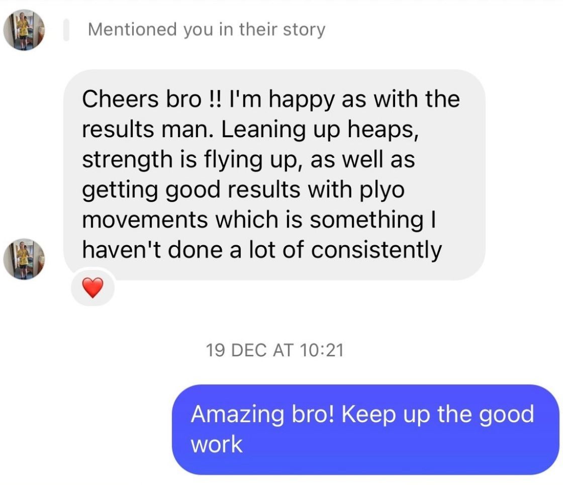 Through direct communication with me, I will help you manage injury through guidance on exercise prescription included in your program. If injury is preventing you from performing your training, I will help you with alternative exercises to assist recovery without your training coming to a halt.
